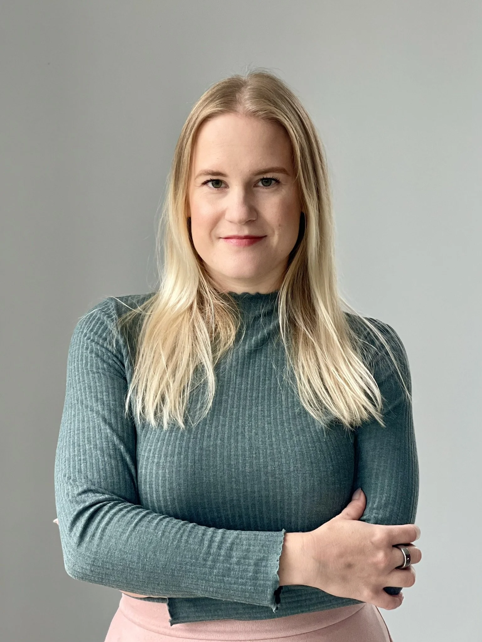 Een jonge vrouw met lang blond haar, gekleed in een donkergroene getailleerde trui en een roze rok, staat voor een neutrale grijze achtergrond en kijkt in de camera met een lichte glimlach.